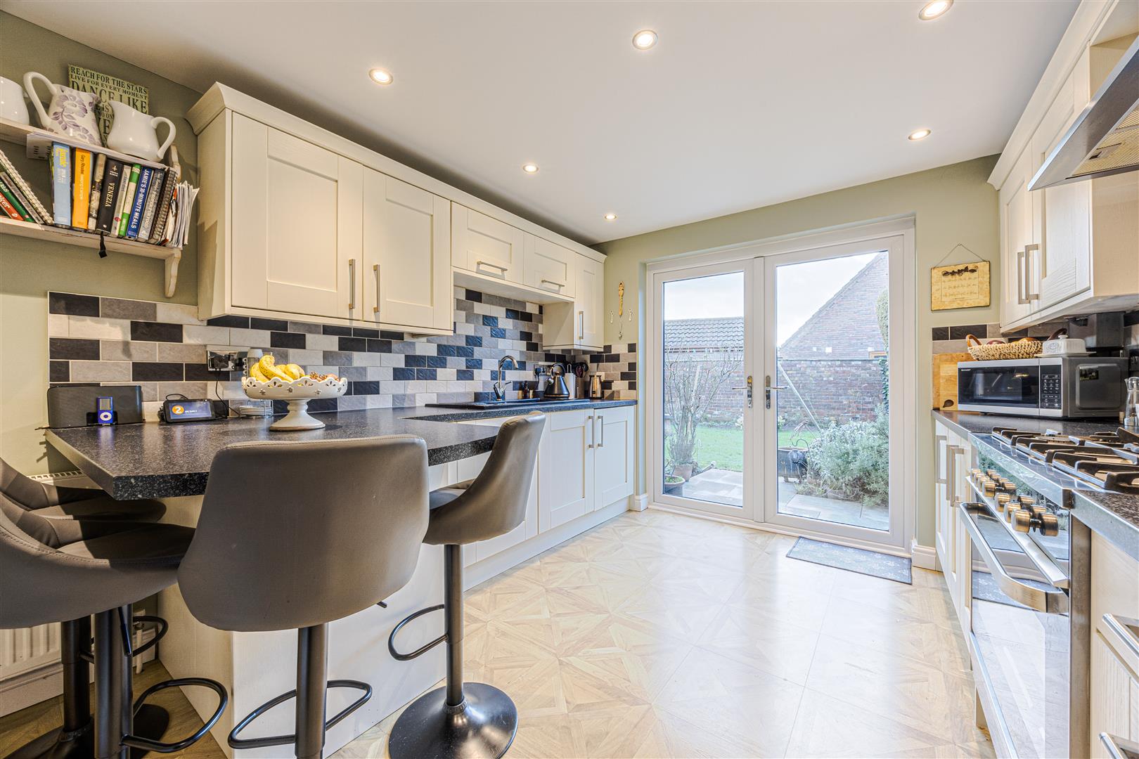 The property has a modern kitchen with a breakfast bar, good size lounge with sliding doors onto the rear garden, a separate dining room which could also be used as an additional bedroom, three double bedrooms, the main having an en-suite and a there is a further four piece family bathroom.